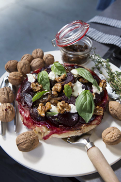 3. Roast the beetroot for 25 to 30 minutes, or until a small paring knife can be inserted into the centre of the beetroot with no resistance. Set aside to cool slightly. Peel off the skin and cut in half.